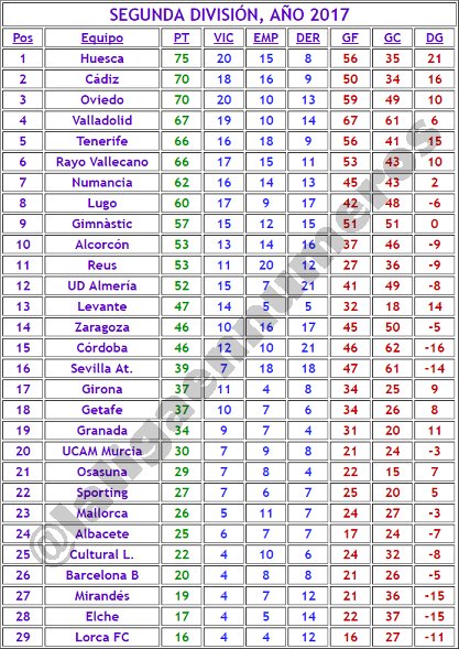 El CD Lugo es octavo en una hipotética clasificación de Segunda División A del año 2017, aunque hay 14 equipos que disputaron 43 partidos, el Nastic 42, mientras que los equipos que ascendieron o descendieron de Primera y los que ascendieron o descendieron a Segunda B jugaron entre los 19 partidos del Osasuna, que tiene uno pendiente con el Nastic, aplazado por la nieve y los 24, franja en las que se encuentran los equipos ascendidos o descendidos.
