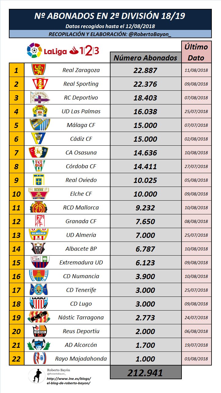 Los 18 ex equipos de Primera División es probable que al final estén por delante de un CD Lugo cuya aspiración sigue siendo en torno a los cuatro mil socios, muy lejos sobre todo de los diez primeros quya superan los diez mil, e incluso Zaragoza y Spórting de Gijón ya superaron los veinte mil, y Deportivo, Las Palmas, Malaga y Cádiz los quince mil, de la que están muy cerca y con posibilidades también de superarla equipos como Osasuna y Granada, mientras que el Oviedo que a superó los diez mil se podría acercar a ellos, o el Elche que también alcanzó los diez mil.